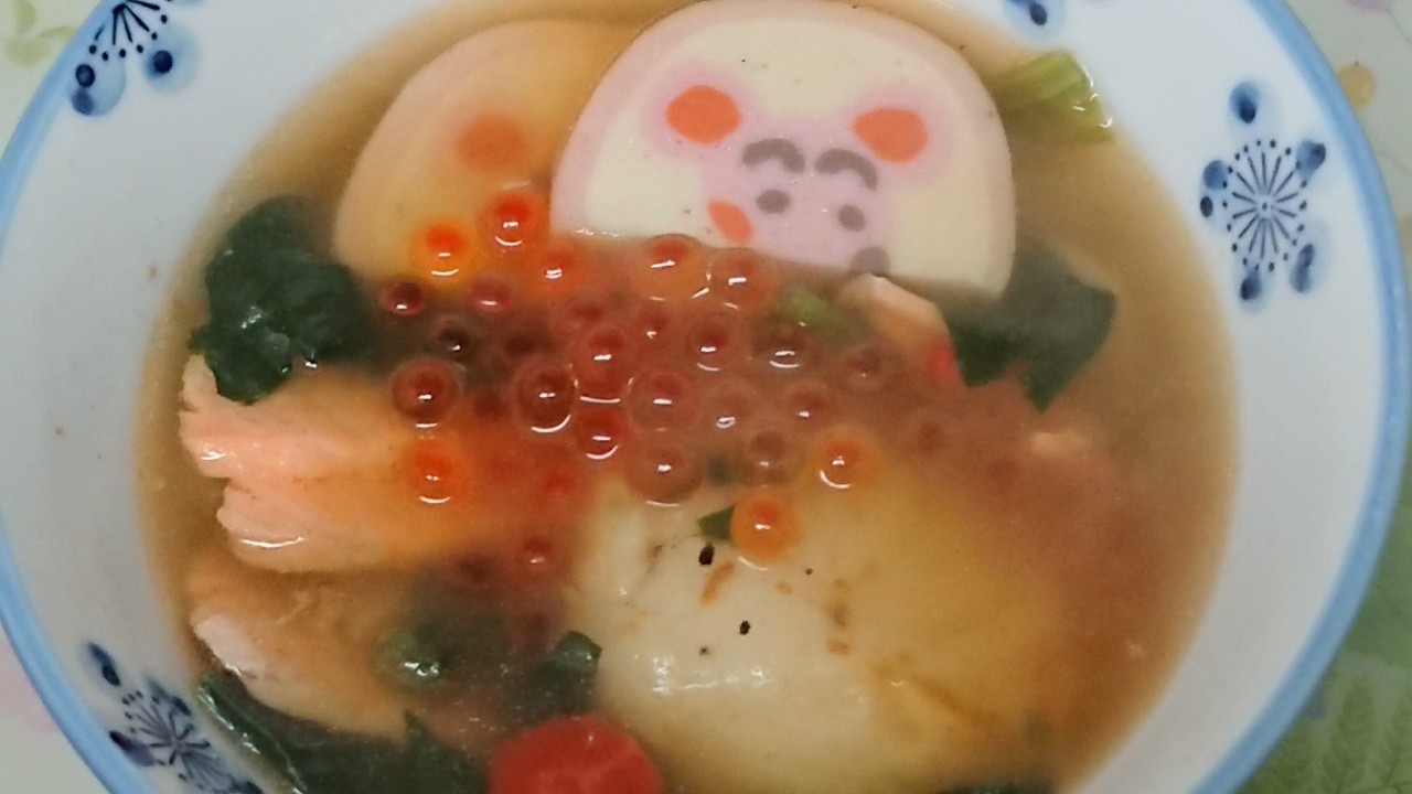 いつも「いくらが入ってない」と言われるので、はじめて作ったサーモンといくら入りの新潟風おすまし雑煮…。