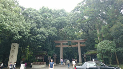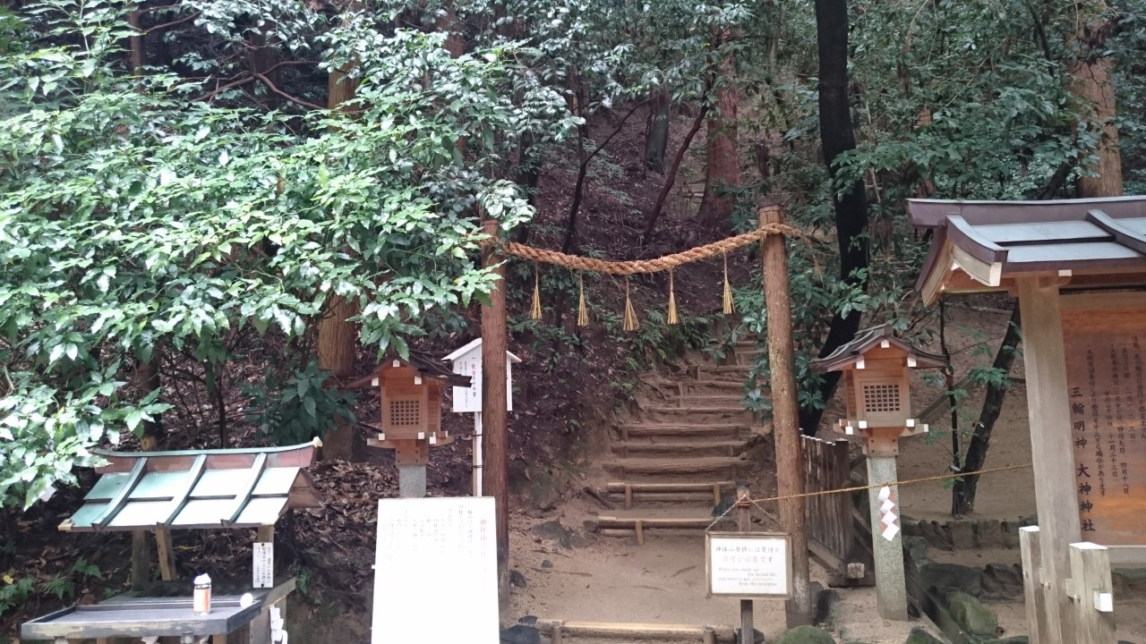 神社の中に、ご神体である三輪山への登山口があります。悪天候でも入山する人がちらほら。
