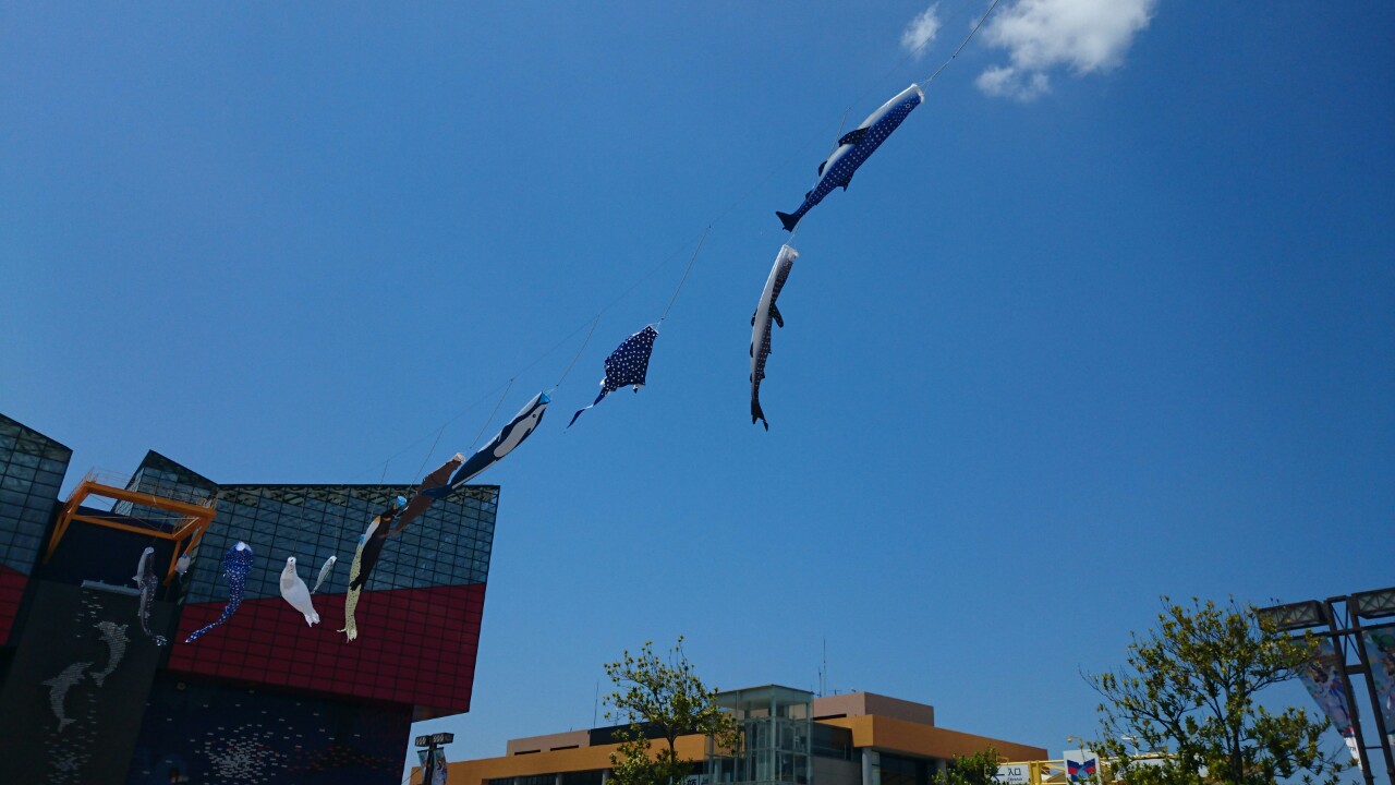 こいのぼりが踊る海遊館。チケット売り場前の行列を見ているだけで熱射病になりそうです。